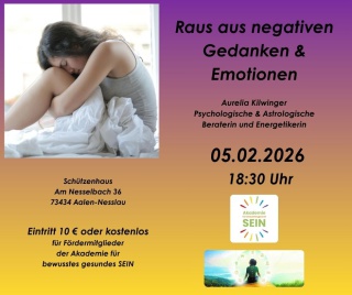 05.02.2026 18.30 Uhr Aurelia Kilwinger, Psychologische und Astrologische Beraterin Vortrag:"Raus aus negativen Gedanken & Emotionen"