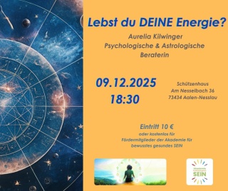 09.12.2025 18.30 Uhr Aurelia Kilwinger, Psychologische und Astrologische Beraterin Vortrag:"Lebst du DEINE Energie - Energielos?"